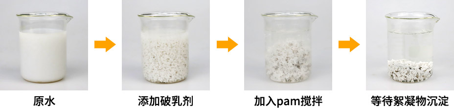 1、本產品直接用計量泵或直接加入到廢水中,氣動攪動數分鐘后進行沉降或氣浮,即可得到破乳后的清液。